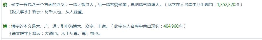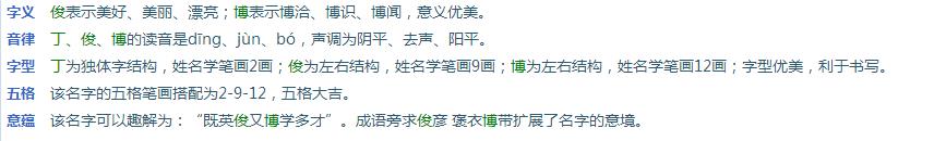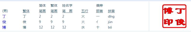 苏州丁先生您好! 您在《天廷起名网》为您家宝宝定制的F型,富贵人生,稳健威仪相应的名字已起好。共8套方案:丁俊博 丁宇泽 丁仲航 丁泰宏 丁俊豪 丁全洲 丁泓嘉 丁冠闻。祝您的宝宝好运,挑选一个最适合您家宝宝的好名字。徐天廷老师帮您家宝宝取得名字点评如下: 丁俊博 男 生日(公历) 2019年 2月 15日 17点47分 生日(农历) 己亥年 一月 十一 酉时 生辰八字 己亥 丙寅 癸未 辛酉 八字五行 土水 火木 水土 金金 总述:八字喜「水」,起名时建议用五行属性为「水」的汉字,或者与「水」具有相生关系的汉字。 详细分析如下: 生辰八字日主天干为:癸 (同类为:水金;异类为:木火土)。 喜用神分析:〖同类得分〗:水1.7,金2,共计3.7分;〖异类得分〗:木1.368,火1.92,土1.59,共计4.878分;〖差〗(同类-异常):-1.178分。 〖综合旺衰得分〗:-1.178分,八字喜「水」,「水」就是此命的「喜用神」。丁俊博 五行属性是火火水,因此宝宝人生命理大吉!