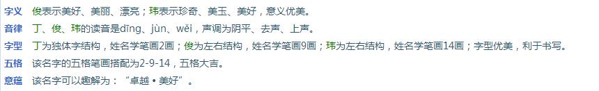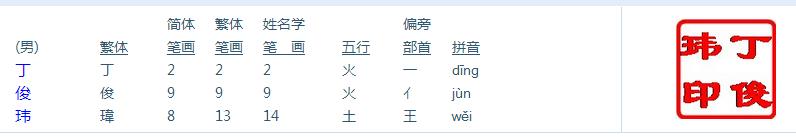 杭州丁先生您好! 您在《天廷起名网》为您家宝宝定制的F型,富贵人生,稳健威仪相应的名字已起好。共8套方案:丁俊玮 丁茂城 丁启翔 丁禹翔 丁培伦 丁宇辉 丁俊硕 丁仲纬 。祝您的宝宝好运,挑选一个最适合您家宝宝的好名字。徐天廷老师帮您家宝宝取得名字点评如下: 丁俊玮 男 生日(公历) 2019年 3月 9日 16点6分 生日(农历) 己亥年 二月 初三 申时 生辰八字 己亥 丁卯 乙巳 甲申 八字五行 土水 火木 木火 木金 总述:八字喜「土」,起名时建议用五行属性为「土」的汉字,或者与「土」具有相生关系的汉字。 详细分析如下: 生辰八字日主天干为:乙 (同类为:木水;异类为:金火土)。 喜用神分析:〖同类得分〗:木3.96,水1,共计4.96分;〖异类得分〗:金1,火2.04,土1,共计4.04分;〖差〗(同类-异常):0.92分。 〖综合旺衰得分〗:0.92分,八字喜「土」,「土」就是此命的「喜用神」。 丁俊玮,五行属性是火火土,因此宝宝人生命理大吉!