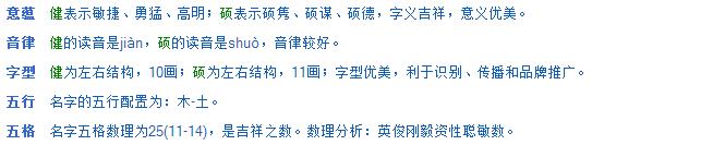 您在《天廷起名网》为您公司定制的名字已起好,已发到您邮箱,请到时注意查收。一共起了8套同命理的名字供你挑选。健硕 展康 捷康 卓林 杰美 恒朗 奥伦 欧瑞 祝你好运,挑选一个最适合您公司的名字。徐天廷(风水皇)帮您公司取得名字点评如下: