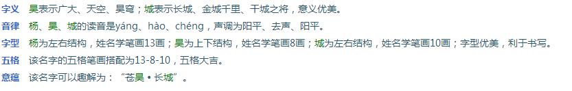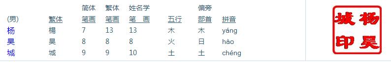 苏州杨先生您好! 您在《天廷起名网》为您家宝宝定制的F型,富贵人生,稳健威仪相应的名字已起好。共8套方案:杨昊城 杨明轩 杨亚伦 杨旺达 杨茂辰 杨基新 杨晟希 杨培琪 。祝您的宝宝好运,挑选一个最适合您家宝宝的好名字。徐天廷老师帮您家宝宝取得名字点评如下: 杨昊城 男 生日(公历) 2019年 1月 3日 15点26分 生日(农历) 戊戌年 冬月 廿八 申时 生辰八字 戊戌 甲子 庚子 甲申 八字五行 土土 木水 金水 木金 总述:八字喜「土」,起名时建议用五行属性为「土」的汉字,或者与「土」具有相生关系的汉字。 详细分析如下: 生辰八字日主天干为:庚 (同类为:金土;异类为:木水火)。 喜用神分析:〖同类得分〗:金2,土1.5,共计3.5分;〖异类得分〗:木2.4,水2.76,火0.2,共计5.36分;〖差〗(同类-异常):-1.86分。 〖综合旺衰得分〗:-1.86分,八字喜「土」,「土」就是此命的「喜用神」。 杨昊城,五行属性是木火土,因此宝宝人生命理大吉!