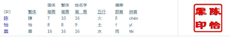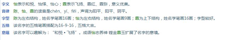 苏州陈先生您好! 您在《天廷起名网》为您家宝宝定制的F型,富贵人生,稳健威仪相应的名字已起好。共10套方案:陈怡霏 陈禹涵 陈妍嘉 陈妍菲 陈玥冰 陈美雯 陈妍婷 陈美澄 陈怡洁 陈希凤。祝您的宝宝好运,挑选一个最适合您家宝宝的好名字。徐天廷老师帮您家宝宝取得名字点评如下: 陈怡霏 女 生日(公历) 2019年 2月 1日 9点5分 生日(农历) 戊戌年 腊月 廿七 巳时 生辰八字 戊戌 乙丑 己巳 己巳 八字五行 土土 木土 土火 土火 总述:八字喜「水」,起名时建议用五行属性为「水」的汉字,或者与「水」具有相生关系的汉字。 详细分析如下: 生辰八字日主天干为:己 (同类为:土火;异类为:金木水)。 喜用神分析:〖同类得分〗:土4.4,火1.6,共计6分;〖异类得分〗:金1.254,木1.06,水0.33,共计2.644分;〖差〗(同类-异常):3.356分。 〖综合旺衰得分〗:3.356分,八字喜「水」,「水」就是此命的「喜用神」。陈怡霏五行属性是火土水,因此宝宝人生命理大吉!